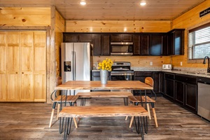 ✔ Fully equipped kitchen with stainless steel appliances, Keurig & drip coffee maker (BYO coffee/K-Cups), cookware, and dining space with a table and benches seating up to 6.