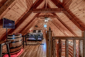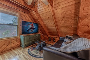Relax in the inviting loft lounge with a TV, comfy seating, and rustic charm.