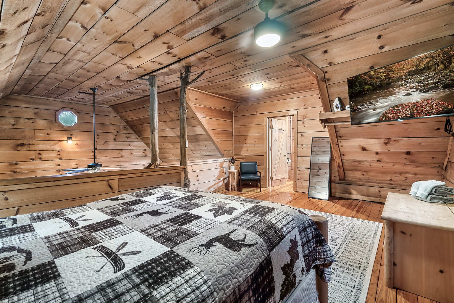 ✔ Loft bedroom featuring a Full-sized bed and private bathroom with a large tile shower.