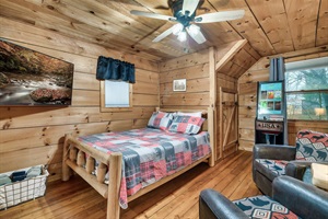 ✔ Open loft bedroom with a QUEEN bed, arcade game, additional seating, and a 55” Roku-equipped TV.