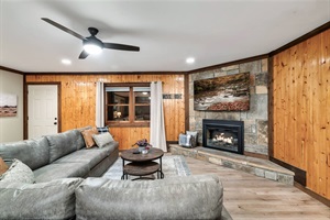 The second-level living area offers ample seating, a 75" Roku TV, and an electric fireplace.