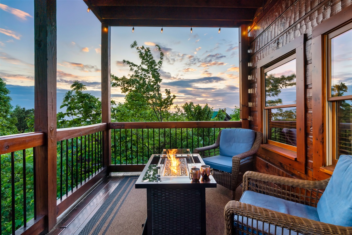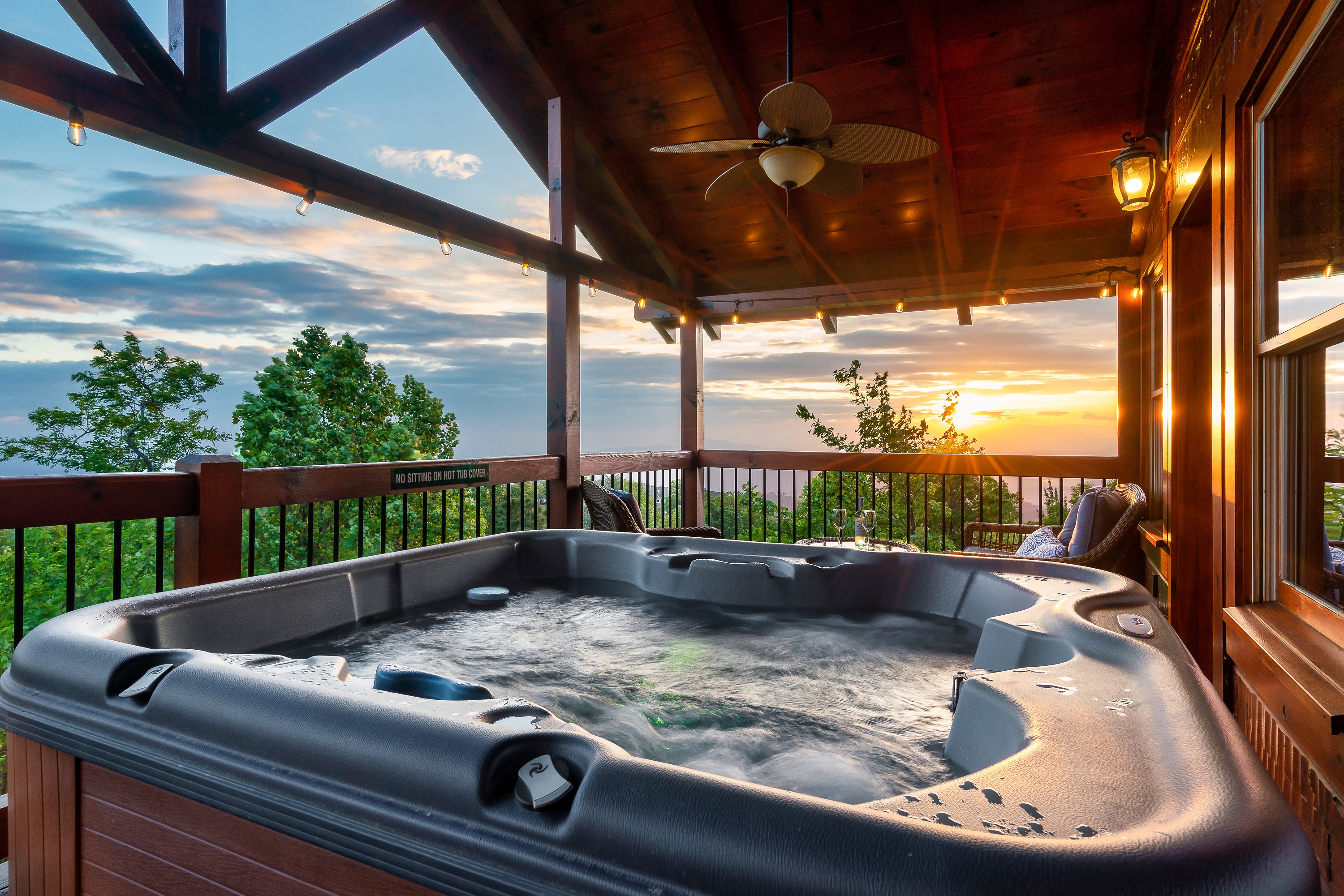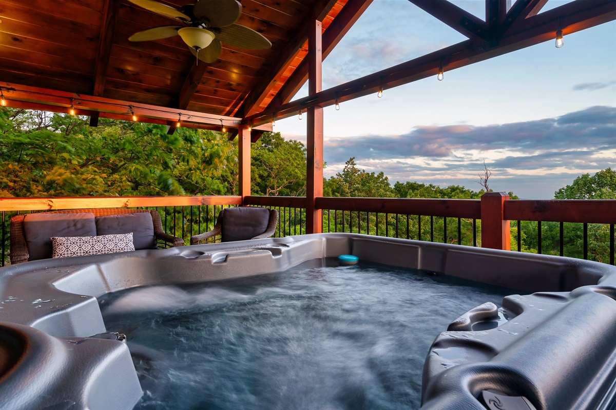 The upper deck features cozy seating and a private hot tub, creating the perfect place to unwind with uninterrupted mountain views.