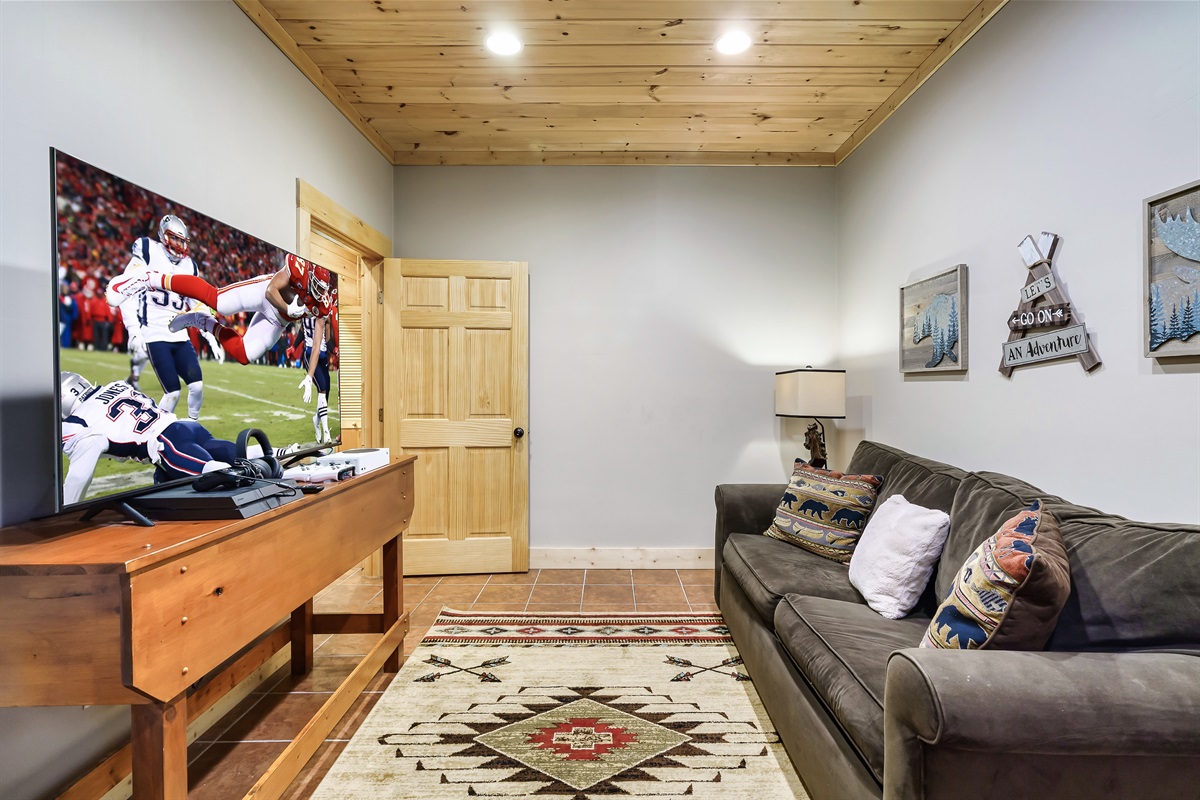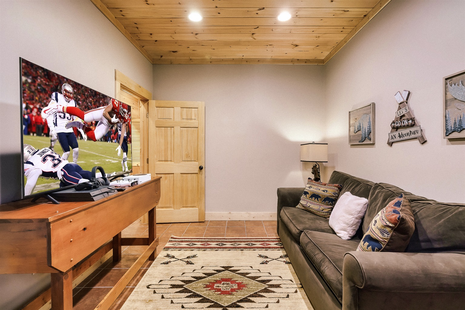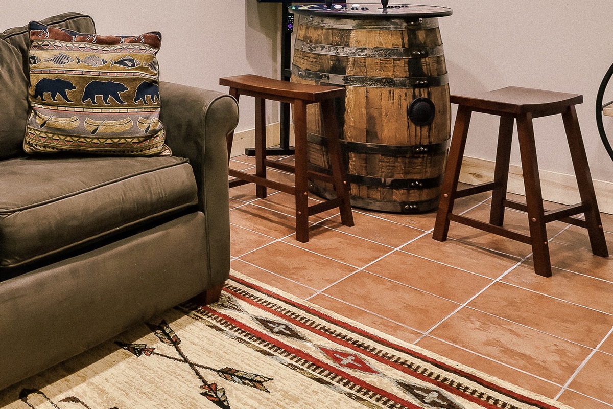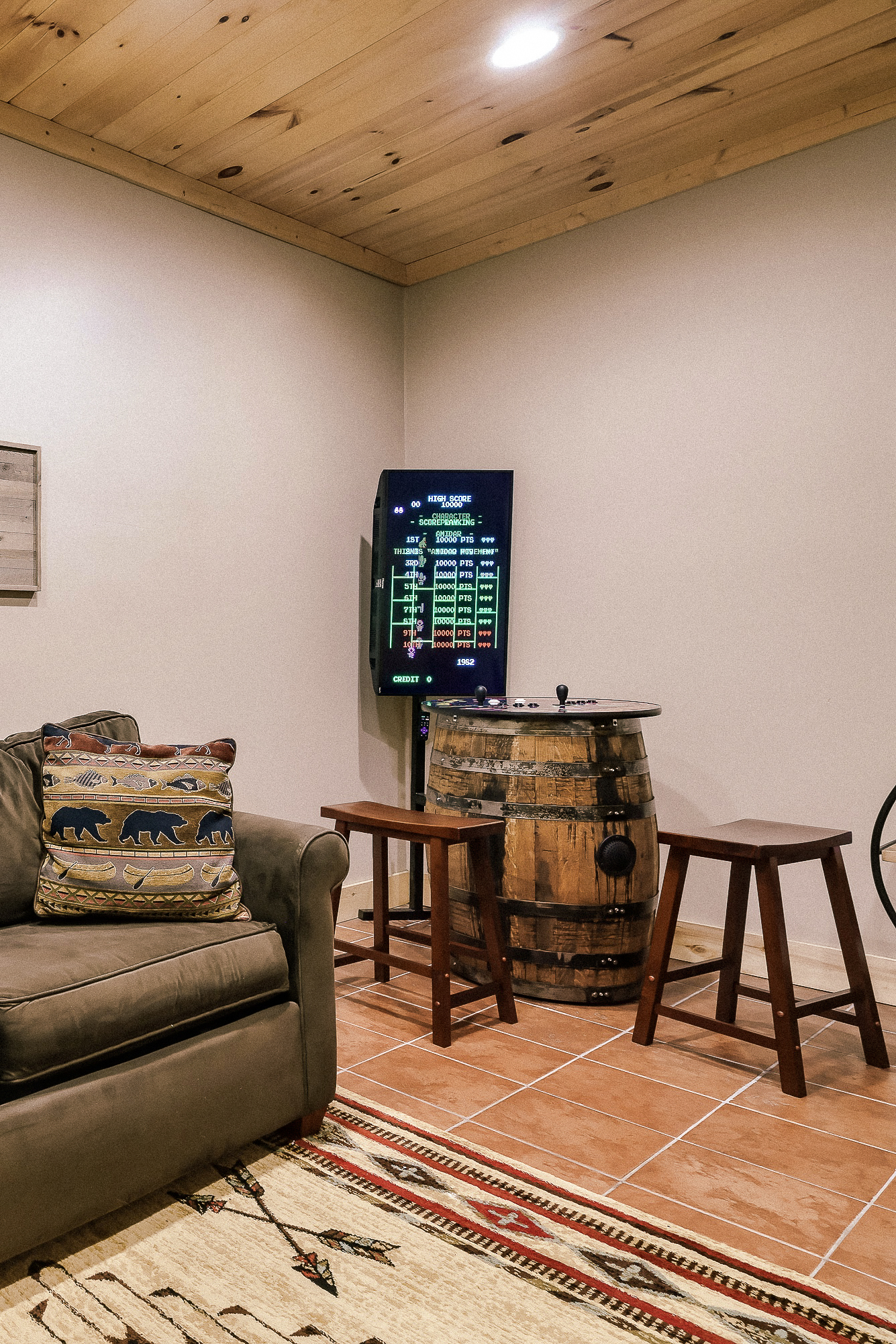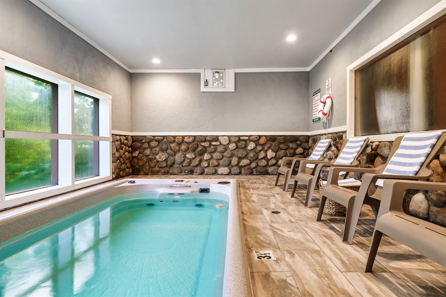 The lower level is home to the showstopper—a spacious indoor heated swim spa. Rain or shine, this space provides hours of entertainment for kids and adults alike. Guests can relax on the surrounding seating while watching the fun.