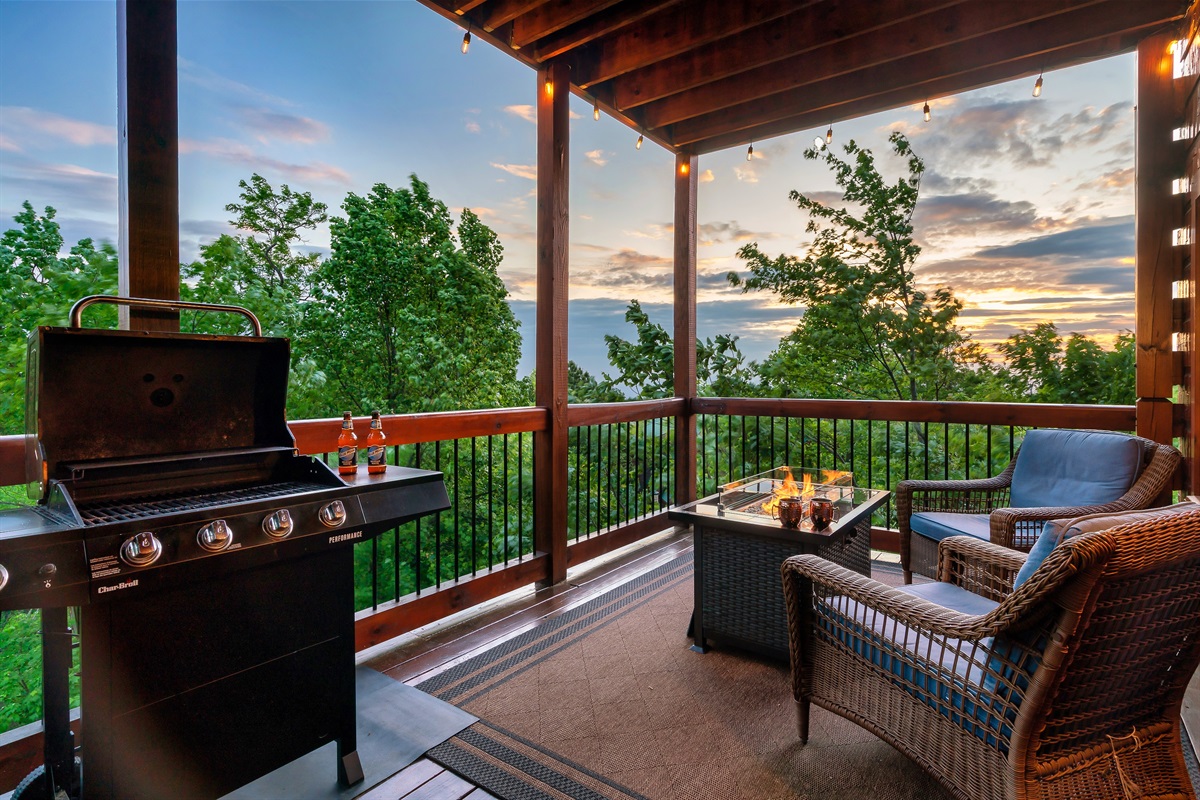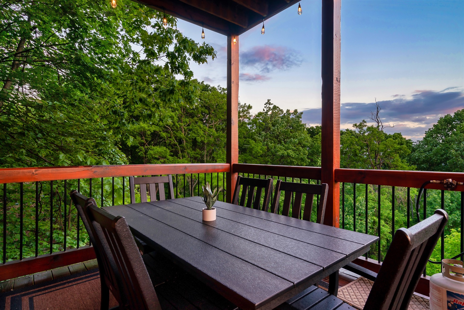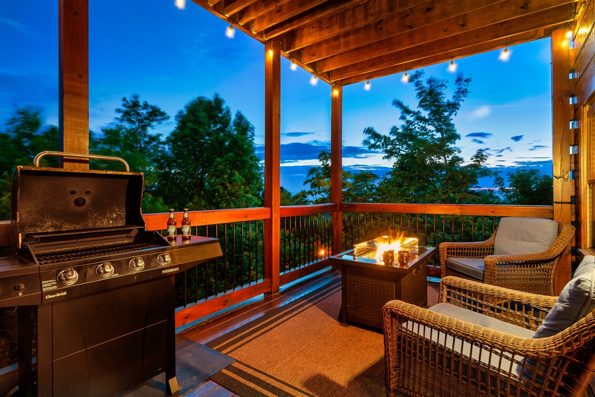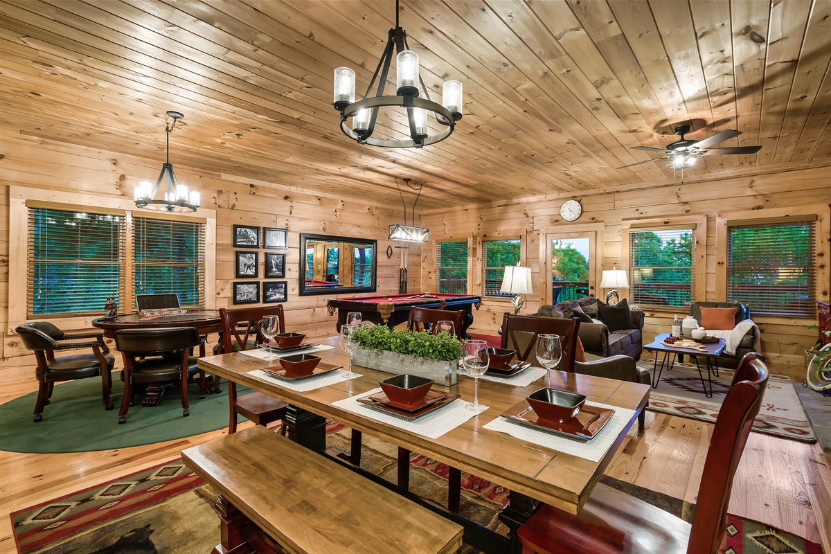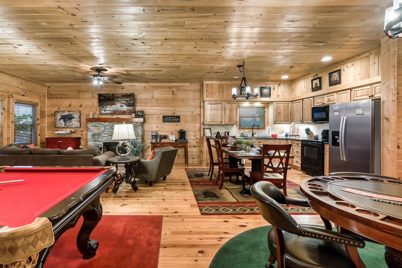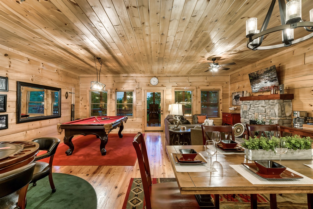 The main level features an open floor plan connecting the kitchen, dining room, and living room, perfect for gathering with family and friends. The dining table seats six, and the poker table adds space for five more. Step outside to enjoy the mountain air on the front deck with patio dining, comfortable seating, and a gas grill, ideal for outdoor meals and relaxation.