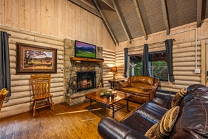 ✔ Living Room with plush leather seating, seasonal gas fireplace (October–March), and flat-screen TV.