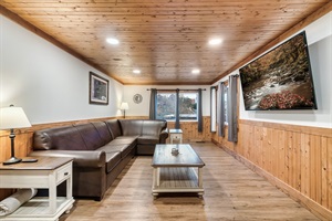 ✔ Comfortable living room with large sectional sofa, 65” Roku-equipped Smart TV, and multicade arcade game.